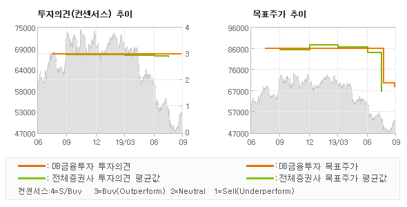 오늘 DB금융투자에서 발표된 'BUY'의견 및 목표주가 68,000원은 전체의견에 수렴하면서 시장의 평균적인 기대감이 비교적 객관적으로 표현된 것으로 풀이되며 목표가평균 대비 4.9% 초과하고 있는 것으로 집계되었다. 참고로 최근에 목표주가를 가장 공격적으로 제시한 미래에셋대우증권은 투자의견 'BUY(유지)'에 목표주가 76,000원을 제일 보수적인 의견을 제시한 삼성증권은 투자의견 'HOLD'에 목표주가 48,000원을 제시한 바 있다.