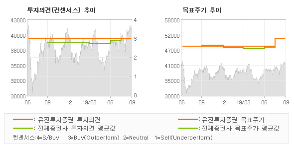 유진투자증권의 동종목에 대한 최근 1년동안의 투자의견은 전체적으로 큰 변화없이 유지되고 있다. 목표주가는 2018년9월 48,000원이 저점으로 제시된 이후 이번에 발표된 51,000원까지 꾸준하게 상향조정되어 왔다.