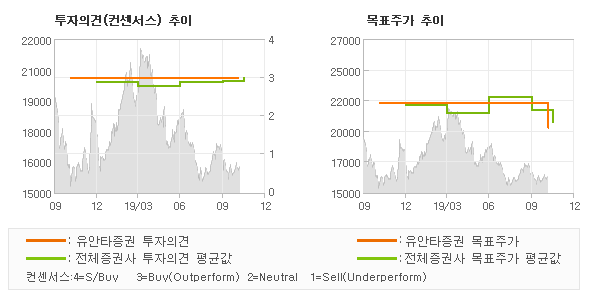 오늘 유안타증권에서 발표된 'BUY(유지)'의견 및 목표주가 20,000원은 전체 컨센서스 대비해서 대체적으로 평균치에 해당하는 수준으로, 이번 의견은 동종목에 대한 전체적인 흐름에서 크게 벗어나지 않은 것으로 파악되며 목표가평균 대비 7.8%정도 미달하고 있는 것으로 집계되었다. 참고로 최근에 목표주가를 가장 공격적으로 제시한 케이프투자증권은 투자의견 'BUY(유지)'에 목표주가 25,000원을 제일 보수적인 의견을 제시한 신한금융투자증권은 투자의견 'BUY(유지)'에 목표주가 19,500원을 제시한 바 있다.