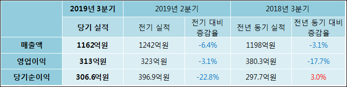 11월 8일 컴투스(078340)의 2019년 3분기 연결 잠정 실적이 발표됐다. 영업이익이 전년 같은 기간 대비해서는 17.7% 줄었고, 매출액 역시 1162억원으로 3.1% 감소했다. 반면 당기순이익은 3% 확대된 306.6억원으로 발표되었다.
