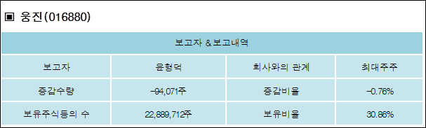 웅진(016880)은 08일 최대주주 윤형덕을 비롯한 특별관계자의 보유주식이 감소되었다고 발표했다. 이는 직전 보고일보다 94,071주 감소하여 지분율은 30.86%로 하락했다. 이번 보고 사유는 특별관계추가,해소/주식매수선택권부여및주식담보계약체결으로 알려졌다.