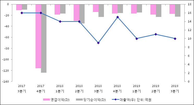 11월 8일 제낙스(065620)의 2019년 3분기 연결 확정 실적이 발표됐다. 매출액은 전년 같은 기간 대비해서 8.91% 증가하여 10억원을 달성했다. 영업이익은 -18.9억원에서 -17.2억원으로 적자폭이 축소되었다고 발표했다. 당기순이익은 -27.1억원에서-22.5억원으로 적자축소되었다고 발표했다.