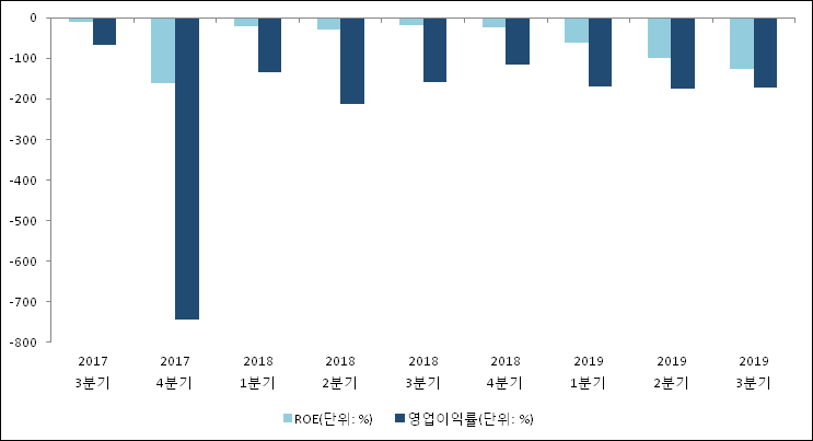 이번분기 기준으로 추정되는 제낙스의 자기자본이익률(ROE)은 -127.7%로 나타났다. ROE는 최근 4분기 이상 연속으로 하락했다. 전년 동기인 2018년 3분기 ROE는 -19%로 이번 분기에 108.7%p 하락했다. 한편 동종목의영업이익률은 -172%이다. 이는 최근 일년과 비교했을 때 급등하였다. 지난해 동기 영업이익률은 -158.6%로 이번 3분기에 13.4%p 하락했다.