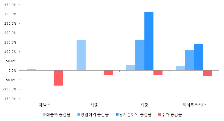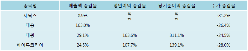 다음은 제낙스와 동일 업종 내 비교 그룹 종목의 각각 최근 실적의 전년 동기 대비 성장률이다. 제낙스의 매출액은 증가했지만 증감율은 타 종목 대비 저조한 편이다. 그리고 주가의 하락율이 가장 큰 편으로 나타났다.