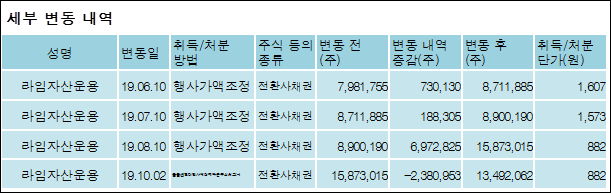 젬백스지오(041590)는 11일 주주 라임자산운용주식회사의 보유주식이 증가되었다고 발표했다. 이는 직전 보고일보다 3,242,734주 증가하여 지분율은 19.19%로 상승했다. 이번 보고 사유는 발행사콜옵션행사및펀드이관에 따른 변동보고로 알려졌다.