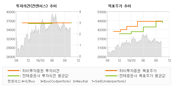 하이투자증권의 동종목에 대한 최근 1년동안의 투자의견은 전체적으로 큰 변화없이 유지되고 있다. 목표주가는 2018년11월 41,000원이 저점으로 제시된 이후 이번에 발표된 47,000원까지 꾸준하게 상향조정되어 왔다.
