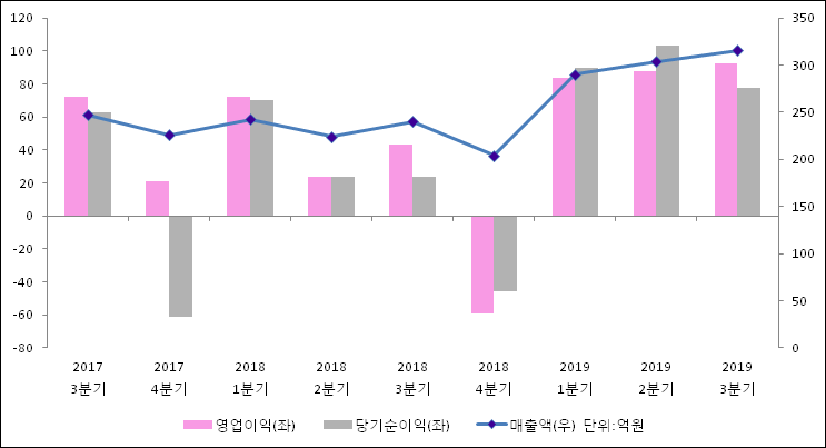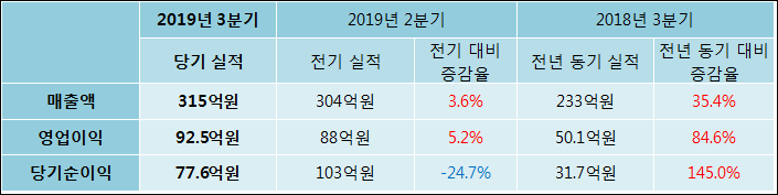 11월 11일 디오(039840)의 2019년 3분기 연결 확정 실적이 발표됐다. 지난해 같은 기간 대비해서 매출액, 영업이익, 당기순이익 모두 증가하였다. 233억원이었던 매출액은 35.39% 증가하여 315억원을 기록했다. 영업이익은 84.56% 상승하여 92.5억원이고, 당기순이익은 77.6억원으로 발표됐다.