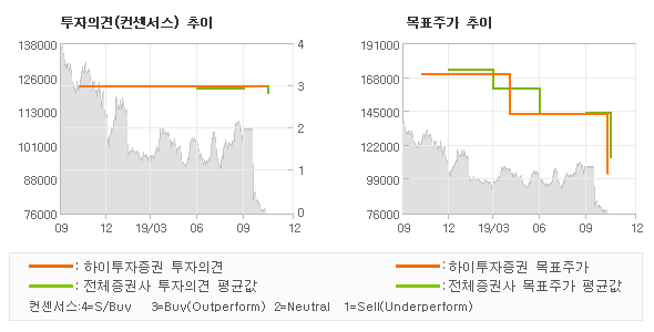 하이투자증권의 동종목에 대한 최근 1년동안의 투자의견은 전체적으로 큰 변화없이 유지되고 있다. 목표주가는 2018년11월 170,000원까지 높아졌다가 2019년4월 143,000원을 최저점으로 목표가가 제시된 이후 최근에 102,000원으로 새롭게 조정되고 있다.