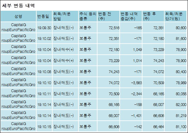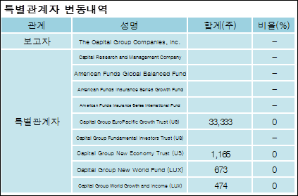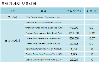 TheCapitalGroupCompanies,Inc.를 비롯한 특별관계자의 보유주식이 감소되었다고 발표했다. 이는 직전 보고일보다 14,366,474주 감소하여 지분율은 4.54%로 하락했다. 이번 보고 사유는 보유비율변동으로 알려졌다.