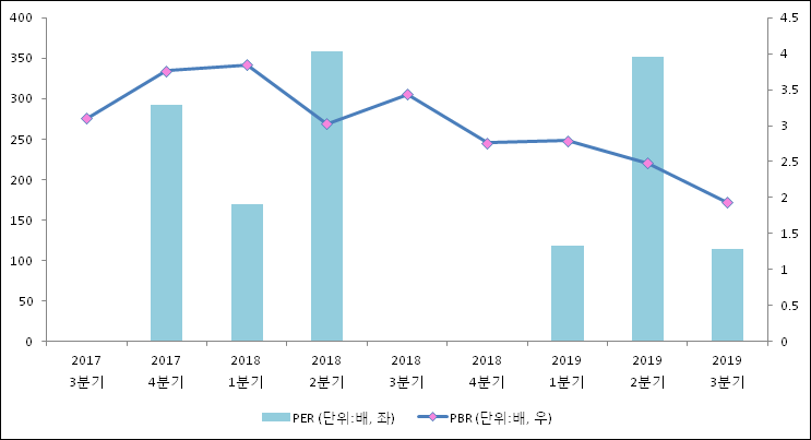 주가가 1주당 수익의 몇배가 되는지 나타내는 주가수익비율(PER)은 114.5배로 나타났다. 직전분기 PER은 351.37배로 이번 분기에 하락했다.주가가 1주당 순자산의 몇배인지 알려주는 주가순자산비율인 PBR은 1.93배이다. 지난해 동기 PBR은 3.43배로 이번 3분기 PBR이 하락했다.