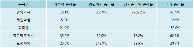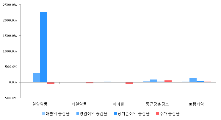 다음은 일양약품과 동일 업종 내 비교 그룹 종목의 각각 최근 실적의 전년 동기 대비 성장률이다. 일양약품의 매출액은 증가했지만 증감율은 타 종목 대비 저조한 편이다. 그리고 주가의 하락율이 비교적 큰 편으로 나타났다.