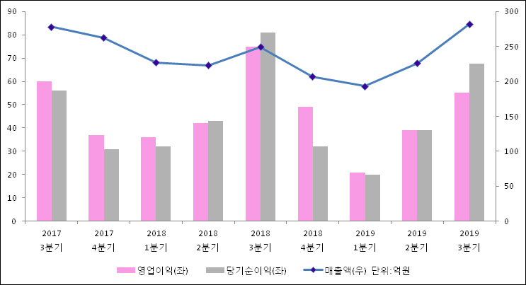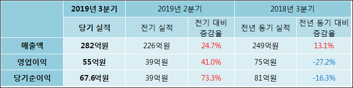 11월 11일 덕산네오룩스(213420)의 2019년 3분기 개별 확정 실적이 발표됐다. 전년 같은 기간 대비 매출액은 13.11% 증가한 282억원으로 집계됐다. 그러나 영업이익과 당기순이익은 27.18%, 16.34%씩 축소되어 55억원, 67.6억원으로 발표됐다.