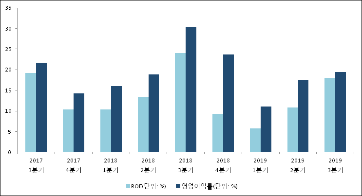 이번분기 기준으로 추정되는 덕산네오룩스의 자기자본이익률(ROE)은 18%로 나타났다. 전년 동기인 2018년 3분기 ROE는 24.1%로 이번 분기에 6.1%p 하락했다. 한편 동종목의영업이익률은 19.5%이다. 지난해 동기 영업이익률은 30.3%로 이번 3분기에 10.8%p 하락했다.