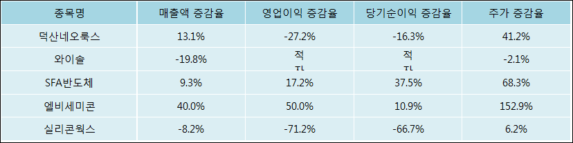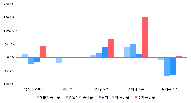 다음은 덕산네오룩스와 동일 업종 내 비교 그룹 종목의 각각 최근 실적의 전년 동기 대비 성장률이다. 덕산네오룩스의 매출액 증감율은 타 종목 대비 우수한 편이다. 그리고 주가 상승률은 양호한 편이다.