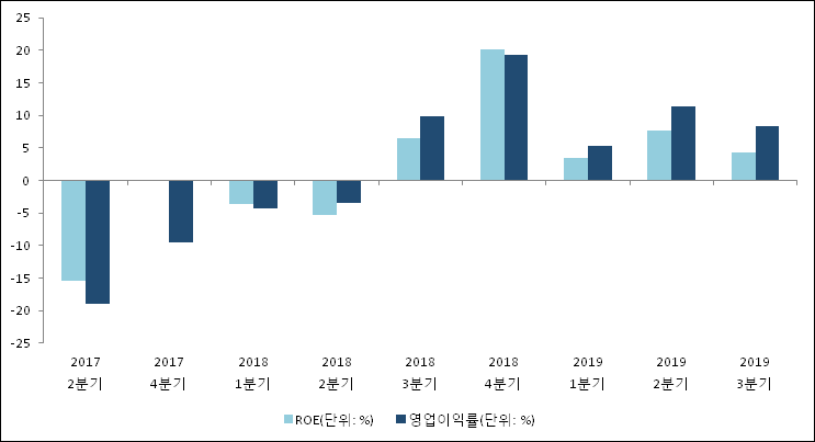 이번분기 기준으로 추정되는 바이넥스의 자기자본이익률(ROE)은 4.3%로 나타났다. 전년 동기인 2018년 3분기 ROE는 6.4%로 이번 분기에 2.1%p 하락했다. 한편 동종목의영업이익률은 8.3%이다. 지난해 동기 영업이익률은 9.9%로 이번 3분기에 1.6%p 하락했다.