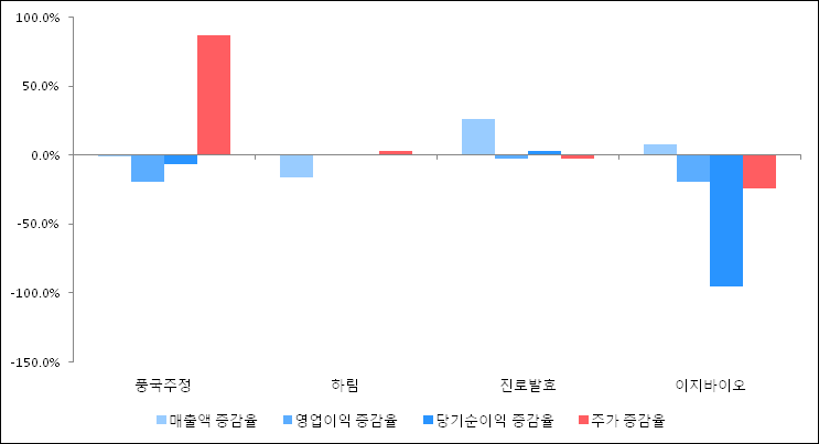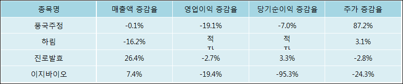 다음은 풍국주정과 동일 업종 내 비교 그룹 종목의 각각 최근 실적의 전년 동기 대비 성장률이다. 풍국주정의 매출액 증감율은 타 종목 대비 저조한 편이다. 그리고 주가는 가장 높은 상승률을 보였다.