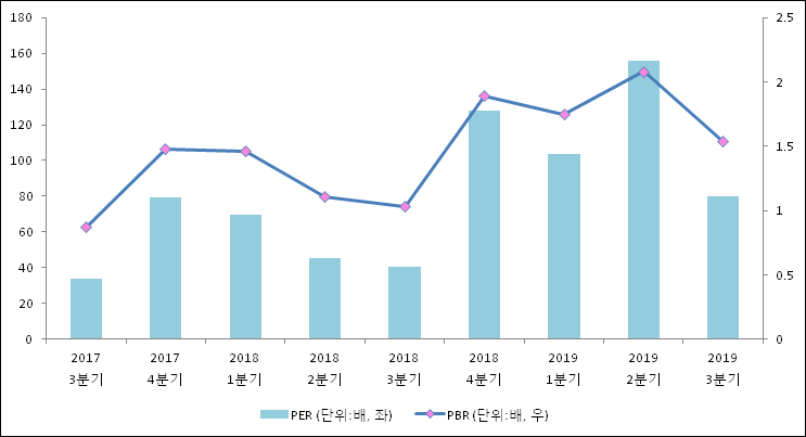 주가가 1주당 수익의 몇배가 되는지 나타내는 주가수익비율(PER)은 33.8배로 나타났다. 이는 최근 일년과 비교했을 때 급락한 수치이다. 3분기 EPS는 상승하고 주가가 하락하였기 때문이다. 전년 동기 PER은 128배로 이번 분기에 하락했다.주가가 1주당 순자산의 몇배인지 알려주는 주가순자산비율인 PBR은 0.87배이다. 지난해 동기 PBR은 1.89배로 이번 3분기 PBR이 하락했다.