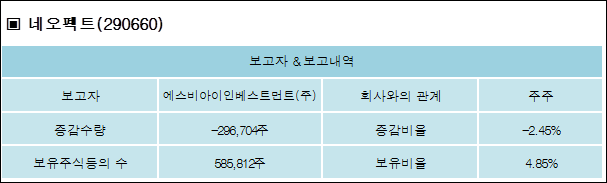 네오펙트(290660)는 11일 주주 에스비아이인베스트먼트(주)를 비롯한 특별관계자의 보유주식이 감소되었다고 발표했다. 이는 직전 보고일보다 296,704주 감소하여 지분율은 4.85%로 하락했다. 이번 보고 사유는 장내매도에 따른 변동보고로 알려졌다.