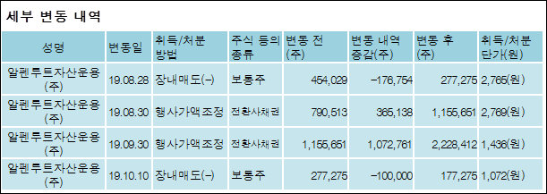 리드(197210)는 11일 기타 알펜루트자산운용(주)의 보유주식이 증가되었다고 발표했다. 이는 직전 보고일보다 2,459,161주 증가하여 지분율은 12.88%로 상승했다. 이번 보고 사유는 상장주식수,전환가액변경및장내매매로인한변동으로 알려졌다.