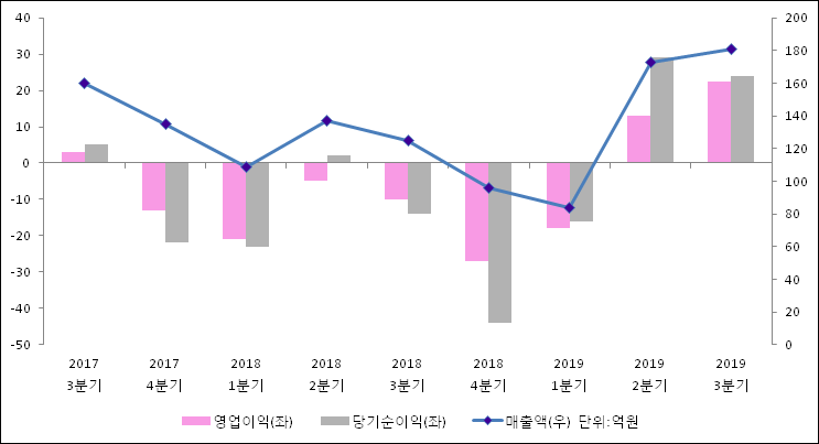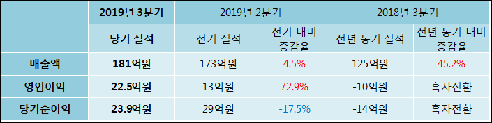 11월 11일 동운아나텍(094170)의 2019년 3분기 개별 확정 실적이 발표됐다. 전년 같은 기간 대비해서 매출액은 45.16% 늘어나서 181억원을 기록했다. 영업이익은 22.5억원으로 -10억원에서 흑자전환되었다. 당기순이익은 23.9억원으로 -14억원에서 흑자전환되었다.