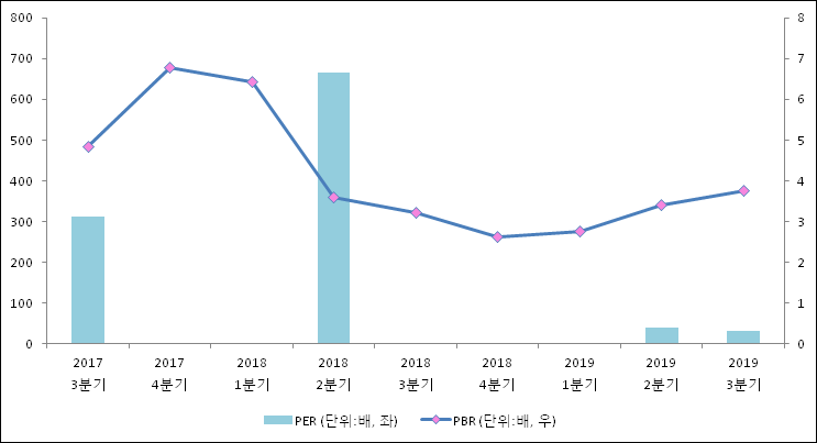 주가가 1주당 수익의 몇배가 되는지 나타내는 주가수익비율(PER)은 33배로 나타났다. 직전분기 PER은 38.72배로 이번 분기에 하락했다.주가가 1주당 순자산의 몇배인지 알려주는 주가순자산비율인 PBR은 3.76배이다. PBR은 최근 3분기 이상 꾸준히 상승하고 있다. 지난해 동기 PBR은 3.21배로 이번 3분기 PBR이 상승했다.