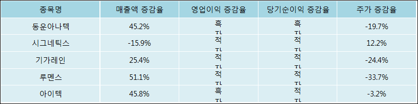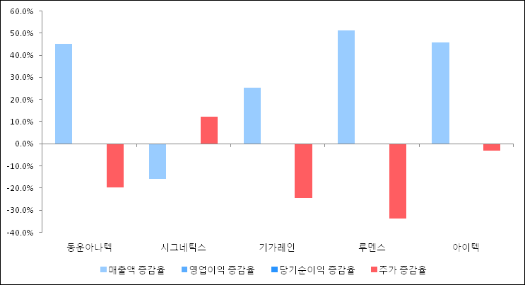 다음은 동운아나텍과 동일 업종 내 비교 그룹 종목의 각각 최근 실적의 전년 동기 대비 성장률이다. 동운아나텍의 매출액 증감율은 타 종목 대비 양호한 편이다. 그리고 주가는 하락하였지만 하락율이 비교적 크지는 않았다.