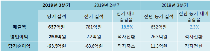 11월 11일 와이지엔터테인먼트(122870)의 2019년 3분기 연결 잠정 실적이 발표됐다. 매출액은 지난해 같은 기간 대비해서 2.3% 감소하여 637억원라고 발표됐다. 영업이익은 26.3억원에서 -29.9억원으로 적자전환되었다. 당기순이익은 -63.5억원으로 11.3억원에서 적자전환되었다.