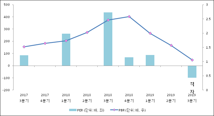 주가가 1주당 수익의 몇배가 되는지 나타내는 주가수익비율(PER)은 85.3배로 나타났다. 전년 동기 PER은 68.25배로 이번 분기에 상승했다.주가가 1주당 순자산의 몇배인지 알려주는 주가순자산비율인 PBR은 1.52배이다. PBR은 최근 3분기 이상 연속으로 하락하다가 이번 분기에 상승했다. 지난해 동기 PBR은 2.58배로 이번 3분기 PBR이 하락했다.