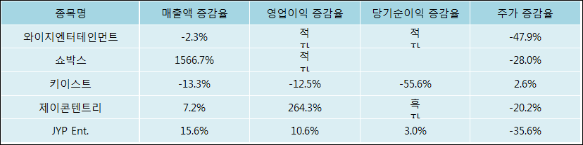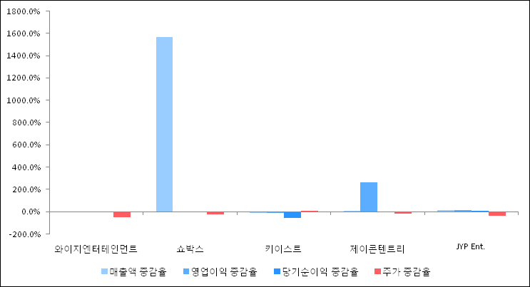 다음은 와이지엔터테인먼트와 동일 업종 내 비교 그룹 종목의 각각 최근 실적의 전년 동기 대비 성장률이다. 와이지엔터테인먼트의 매출액 증감율은 타 종목 대비 저조한 편이다. 그리고 주가의 하락율이 가장 큰 편으로 나타났다.