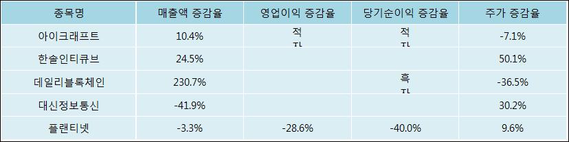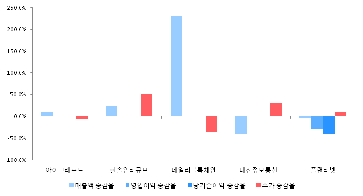 다음은 아이크래프트와 동일 업종 내 비교 그룹 종목의 각각 최근 실적의 전년 동기 대비 성장률이다. 아이크래프트의 매출액 증감율은 타 종목 대비 양호한 편이다. 그리고 주가의 하락율이 비교적 큰 편으로 나타났다.