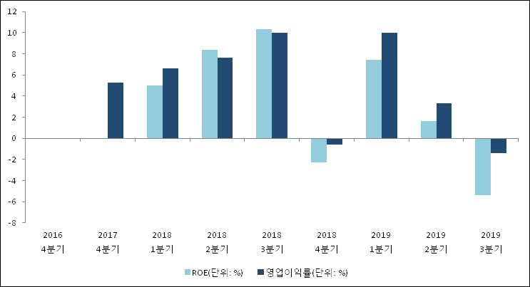 이번분기 기준으로 추정되는 오르비텍의 자기자본이익률(ROE)은 -5.4%로 나타났다. 이는 최근 일년과 비교했을 때 급락한 수치이다. 전년 동기인 2018년 3분기 ROE는 10.3%로 이번 분기에 15.7%p 하락했다. 한편 동종목의영업이익률은 -1.4%이다.최근 일년을 살펴보았을 때 영업이익률이 급락했다. 지난해 동기 영업이익률은 10%로 이번 3분기에 11.4%p 하락했다.