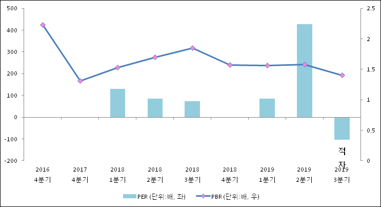 주가가 1주당 순자산의 몇배인지 알려주는 주가순자산비율인 PBR은 1.4배이다. 지난해 동기 PBR은 1.85배로 이번 3분기 PBR이 하락했다.