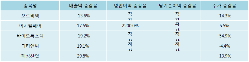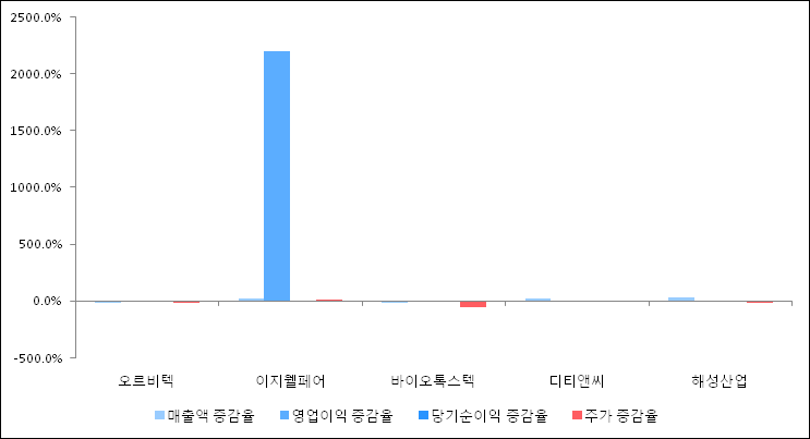 다음은 오르비텍과 동일 업종 내 비교 그룹 종목의 각각 최근 실적의 전년 동기 대비 성장률이다. 오르비텍의 매출액 증감율은 타 종목 대비 저조한 편이다. 그리고 주가의 하락율이 비교적 큰 편으로 나타났다.