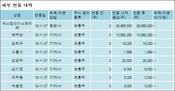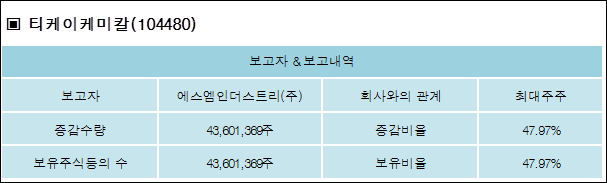 티케이케미칼(104480)은 13일 최대주주 에스엠인더스트리(주)를 비롯한 특별관계자의 보유주식이 증가되었다고 발표했다. 이는 직전 보고일보다 43,601,369주 증가하여 지분율은 47.97%로 상승했다. 이번 보고 사유는로 알려졌다.