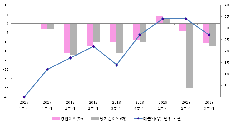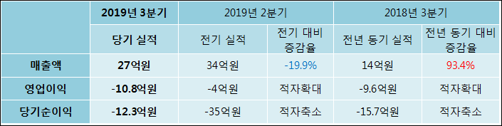 11월 13일 지엘팜텍(204840)의 2019년 3분기 연결 확정 실적이 발표됐다. 매출액은 작년 같은 기간 대비해서 93.39% 증가하여 27억원을 달성했다. 영업이익은 -10.8억원으로 -9.6억원에서 적자폭이 확대되었다. 당기순이익은 -15.7억원에서-12.3억원으로 적자축소되었다고 발표했다.