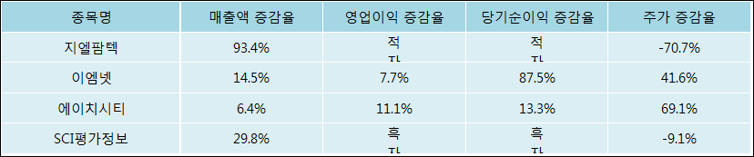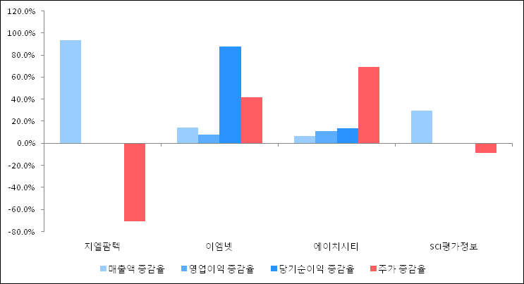 다음은 지엘팜텍과 동일 업종 내 비교 그룹 종목의 각각 최근 실적의 전년 동기 대비 성장률이다. 지엘팜텍의 매출액 증감율은 타 종목 대비 가장 우수한 편이다. 그리고 주가의 하락율이 가장 큰 편으로 나타났다.