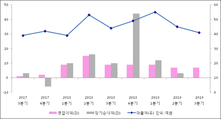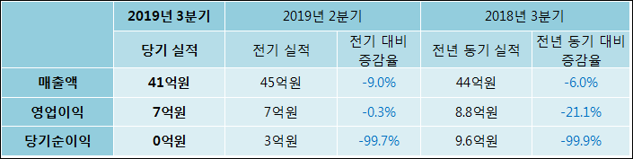11월 13일 아미노로직스(074430)의 2019년 3분기 연결 확정 실적이 발표됐다. 매출액, 영업이익, 당기순이익 모두 전년 동기 대비해서 감소하였다. 매출액은 5.99% 감소한 41억원으로 발표됐다. 영업이익은 21.13% 줄어들어 7억원을, 당기순이익은 99.9% 하락한 0억원을 기록하였다.