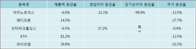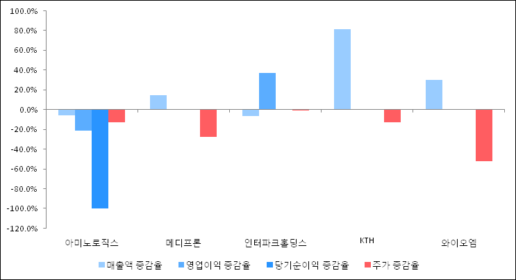 다음은 아미노로직스와 동일 업종 내 비교 그룹 종목의 각각 최근 실적의 전년 동기 대비 성장률이다. 아미노로직스의 매출액 증감율은 타 종목 대비 저조한 편이다. 그리고 주가는 하락하였지만 비교적 적은 하락율을 보였다.