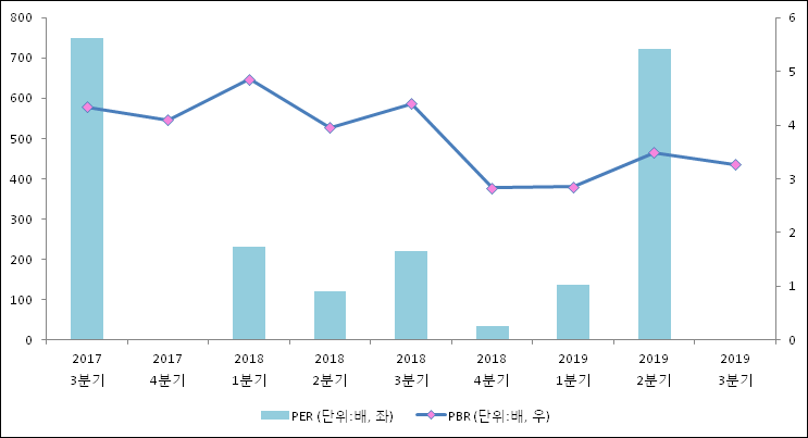 주가가 1주당 순자산의 몇배인지 알려주는 주가순자산비율인 PBR은 3.27배이다. 지난해 동기 PBR은 4.4배로 이번 3분기 PBR이 하락했다.