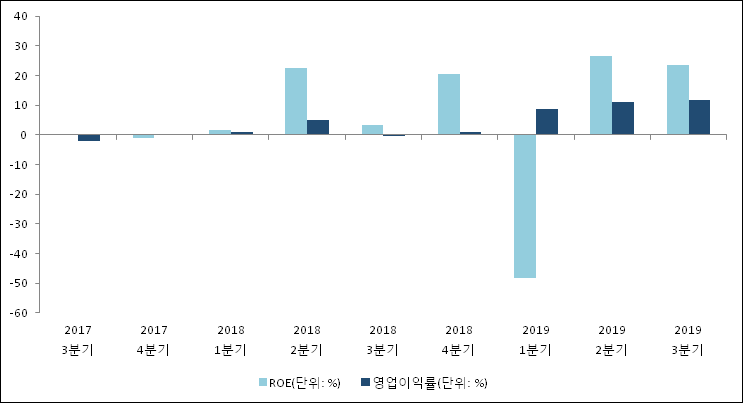 이번분기 기준으로 추정되는 글로벌텍스프리의 자기자본이익률(ROE)은 23.5%로 나타났다. 전년 동기인 2018년 3분기 ROE는 3.4%로 이번 분기에 20.1%p 상승했다. 한편 동종목의영업이익률은 11.8%이다. 최근 4분기 이상 꾸준히 상승하는 추세이다. 지난해 동기 영업이익률은 -0.2%로 이번 3분기가 12%p 상승했다.
