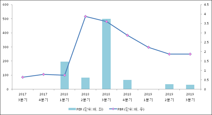 주가가 1주당 수익의 몇배가 되는지 나타내는 주가수익비율(PER)은 32.7배로 나타났다. 전년 동기 PER은 498.75배로 이번 분기에 하락했다.주가가 1주당 순자산의 몇배인지 알려주는 주가순자산비율인 PBR은 1.87배이다. 지난해 동기 PBR은 3.6배로 이번 3분기 PBR이 하락했다.