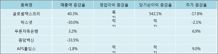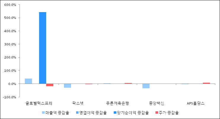 다음은 글로벌텍스프리와 동일 업종 내 비교 그룹 종목의 각각 최근 실적의 전년 동기 대비 성장률이다. 글로벌텍스프리의 매출액 증감율은 타 종목 대비 가장 우수한 편이다. 그리고 주가의 하락율이 가장 큰 편으로 나타났다.
