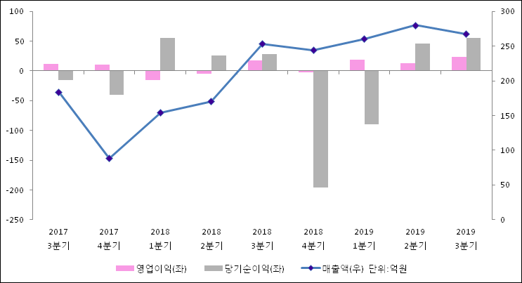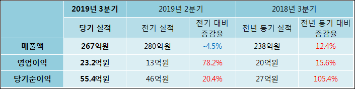 11월 14일 브레인콘텐츠(066980)의 2019년 3분기 연결 확정 실적이 발표됐다. 매출액, 영업이익, 당기순이익 모두 전년 같은 기간 대비 증가했다. 매출액은 12.44%, 늘어난 267억원으로 발표됐다. 영업이익과 당기순이익은 각각 15.62%, 105.42% 증가하여 23.2억원, 55.4억원으로 기록 되었다.