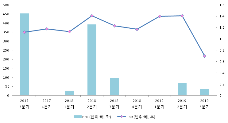 주가가 1주당 수익의 몇배가 되는지 나타내는 주가수익비율(PER)은 35.4배로 나타났다. 전년 동기 PER은 95.45배로 이번 분기에 하락했다.주가가 1주당 순자산의 몇배인지 알려주는 주가순자산비율인 PBR은 0.7배이다. 지난해 동기 PBR은 1.23배로 이번 3분기 PBR이 하락했다.