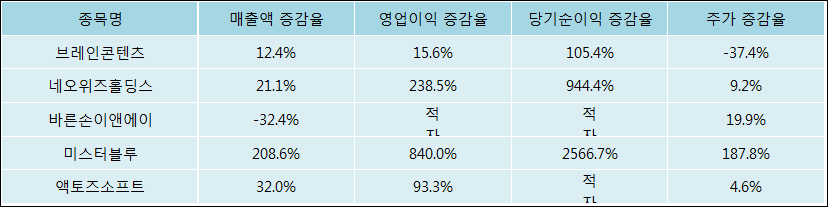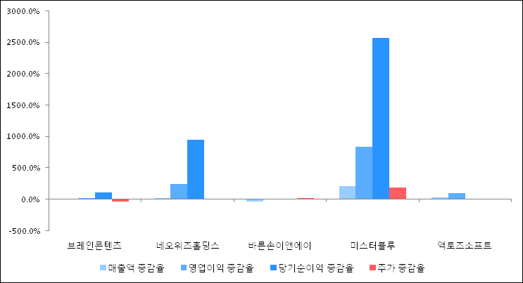 다음은 브레인콘텐츠와 동일 업종 내 비교 그룹 종목의 각각 최근 실적의 전년 동기 대비 성장률이다. 브레인콘텐츠의 매출액은 증가했지만 증감율은 타 종목 대비 저조한 편이다. 그리고 주가의 하락율이 가장 큰 편으로 나타났다.