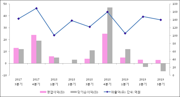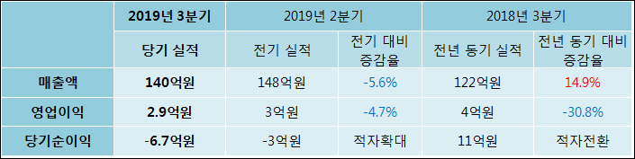 11월 14일 고려제약(014570)의 2019년 3분기 개별 확정 실적이 발표됐다. 매출액은 전년 동기 대비해서 14.91% 증가하여 140억원을 달성했다. 영업이익은 30.75% 감소하여 2.9억원라고 발표됐다. 당기순이익은 -6.7억원으로 11억원에서 적자전환되었다.