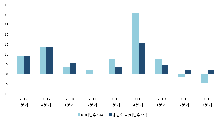 이번분기 기준으로 추정되는 고려제약의 자기자본이익률(ROE)은 -4.3%로 나타났다. ROE는 최근 3분기 이상 연속으로 하락했다. 전년 동기인 2018년 3분기 ROE는 7.6%로 이번 분기에 11.9%p 하락했다. 한편 동종목의영업이익률은 2.1%이다. 지난해 동기 영업이익률은 3.4%로 이번 3분기에 1.3%p 하락했다.