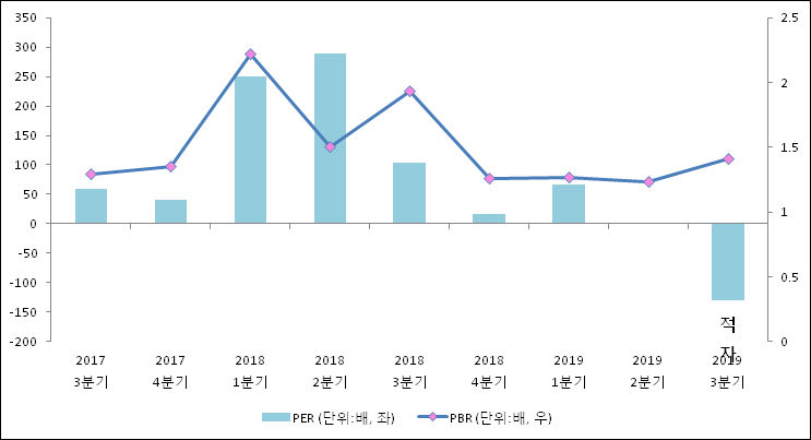 주가가 1주당 순자산의 몇배인지 알려주는 주가순자산비율인 PBR은 1.41배이다. PBR은 최근 1년동안 큰 변동 없이 비슷한 수치를 보이고 있다. 지난해 동기 PBR은 1.93배로 이번 3분기 PBR이 하락했다.