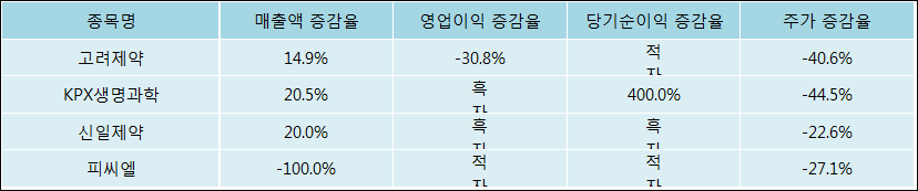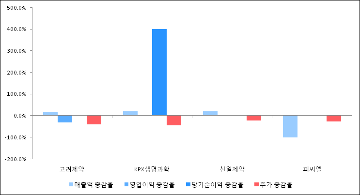 다음은 고려제약과 동일 업종 내 비교 그룹 종목의 각각 최근 실적의 전년 동기 대비 성장률이다. 고려제약의 매출액은 증가했지만 증감율은 타 종목 대비 저조한 편이다. 그리고 주가의 하락율이 비교적 큰 편으로 나타났다.
