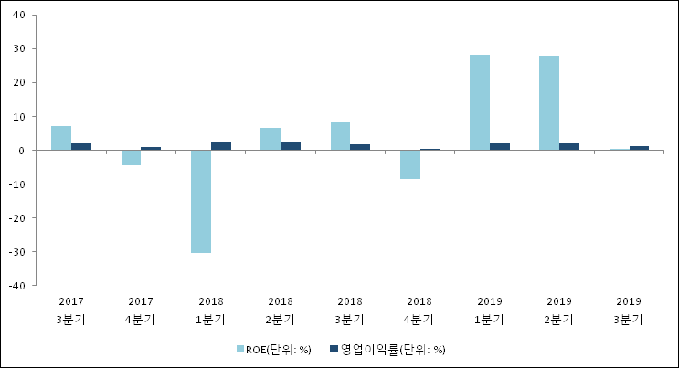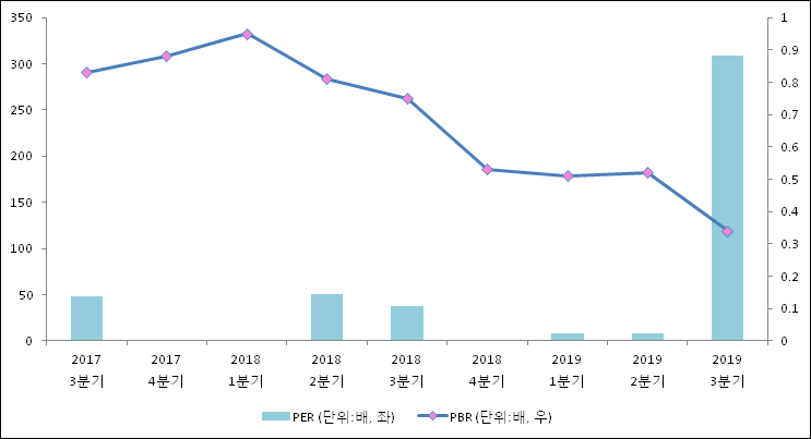 주가가 1주당 수익의 몇배가 되는지 나타내는 주가수익비율(PER)은 309배로 나타났다. 전년 동기 PER은 36.98배로 이번 분기에 상승했다.주가가 1주당 순자산의 몇배인지 알려주는 주가순자산비율인 PBR은 0.34배이다. 지난해 동기 PBR은 0.75배로 이번 3분기 PBR이 하락했다.